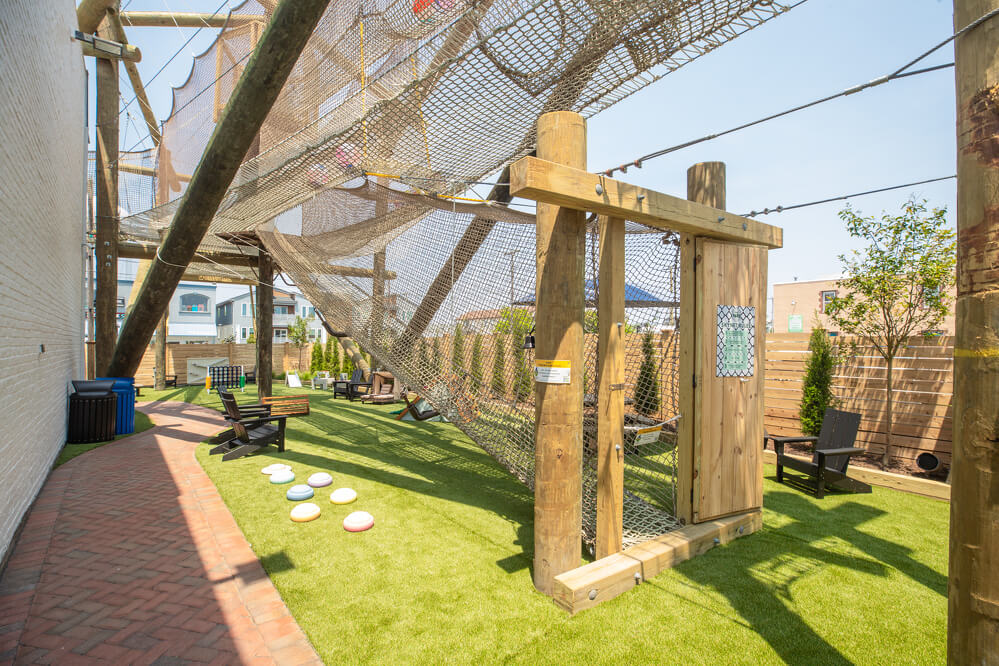 Built in 2025, The Yard was developed as a family-friendly gathering space centered around active and imaginative play. The main attraction is The SkyNet, a three-story elevated netted play system designed for children ages 3 through 10. The structure allows children to climb, explore, and move through multiple levels while remaining visible from below, supporting supervised play in an open-air environment.